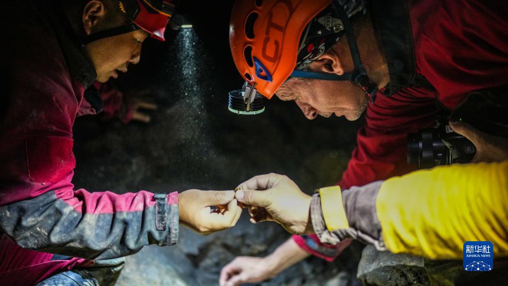 意大利專(zhuān)家和貴州省山地資源研究所科考隊員在雙河洞一處支洞中進(jìn)行科考(9月24日攝)。