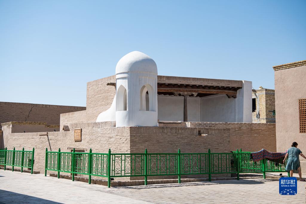 9月22日,在烏茲別克斯坦花拉子模州的希瓦古城,一名婦女從修復一新的哈?!つ吕聨焓矂e吉清真寺外走過(guò)。