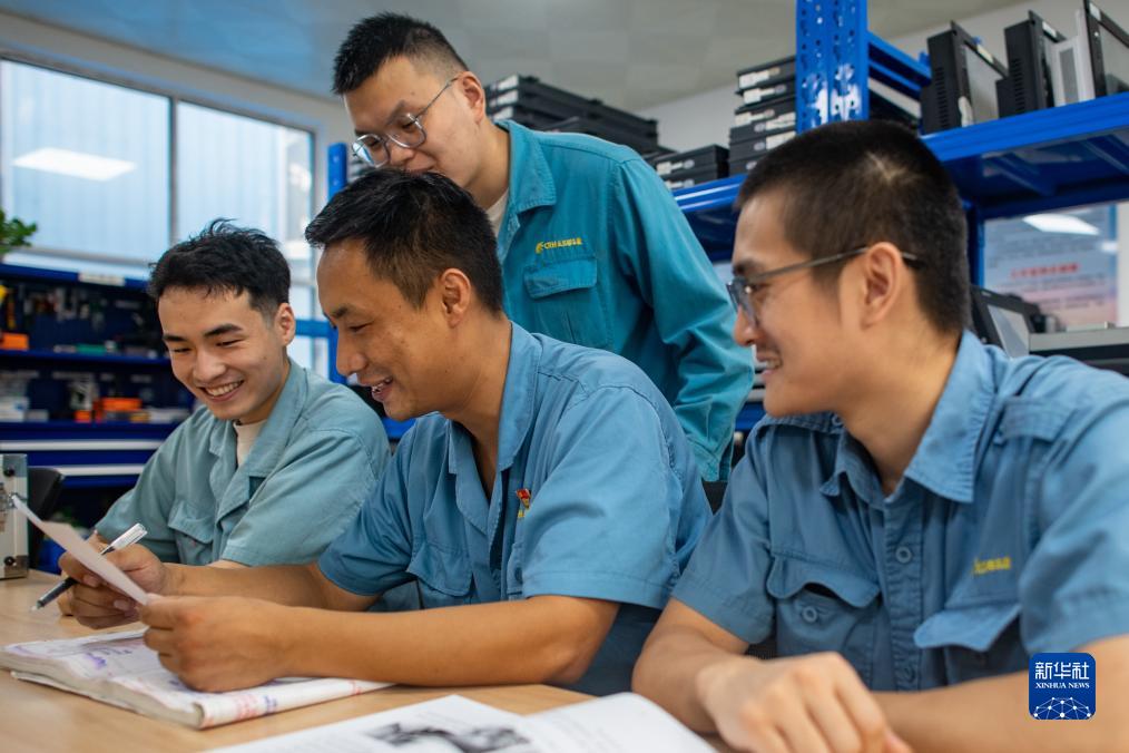 馬耀鋒(中)在與同事們交流(9月27日攝)。