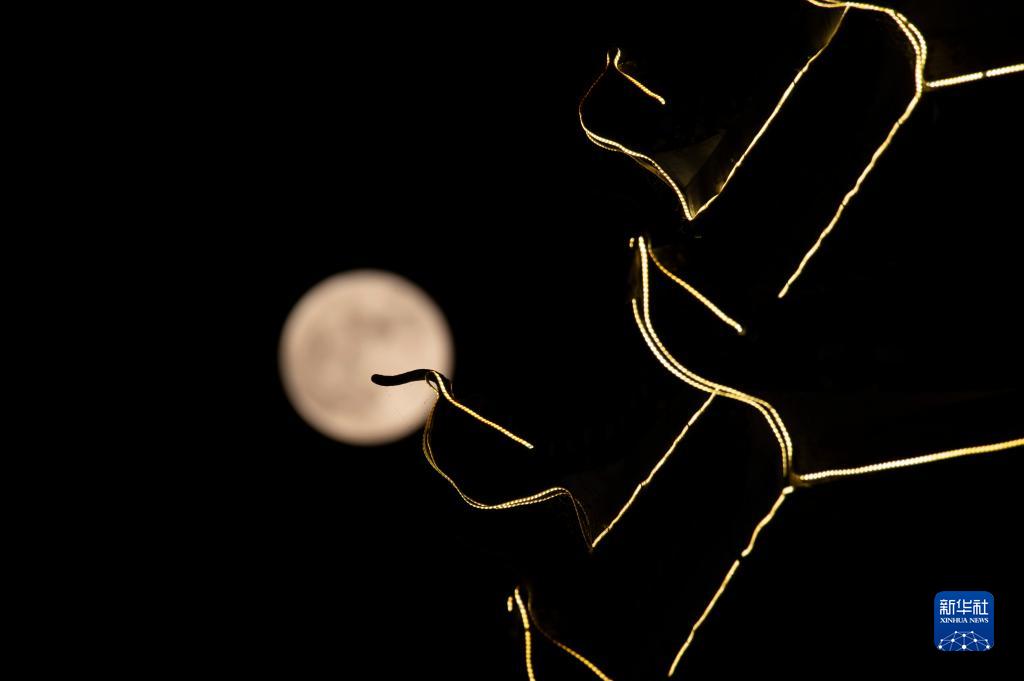 這是9月29日在貴州省黔東南苗族侗族自治州從江縣鼓樓生態(tài)廣場(chǎng)拍攝的月亮。