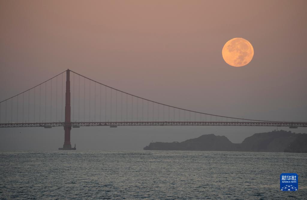 這是9月29日清晨在美國舊金山金門(mén)大橋附近拍攝的月亮。