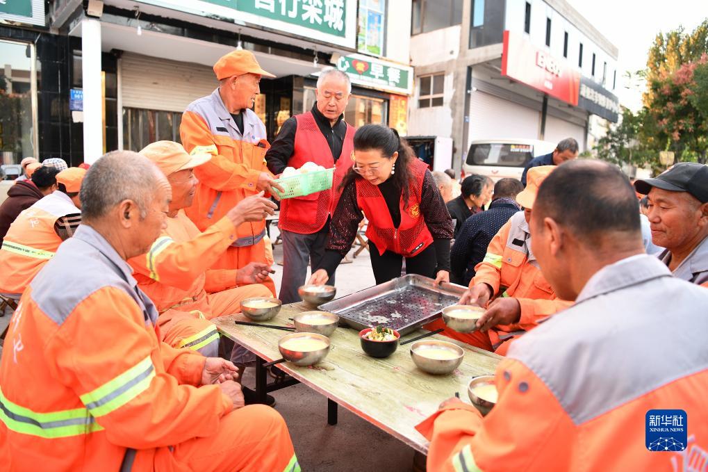 9月30日,在河北省石家莊市欒城區愛(ài)心早餐店,志愿者在為環(huán)衛工人上早餐。