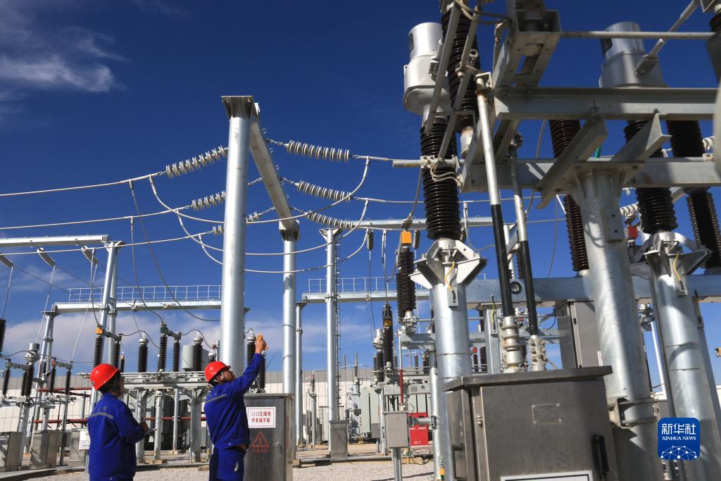 9月30日,工作人員在甘肅省敦煌市北湖風(fēng)電基地海裝紅柳風(fēng)電場(chǎng)110千伏升壓站巡檢設備運行情況。