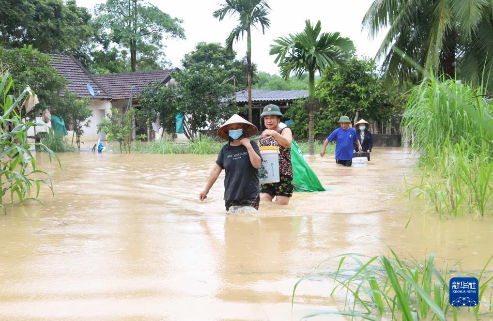 9月27日,受災居民在越南中部義安省涉水轉移生活用品。