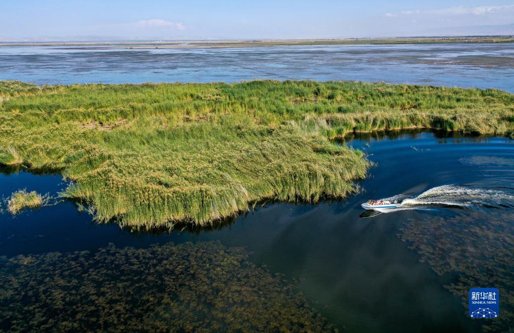 9月15日,在烏梁素海湖面上,武蓉、馮琛和劉瑩慧乘坐快艇去采集湖水樣本(無(wú)人機照片)。