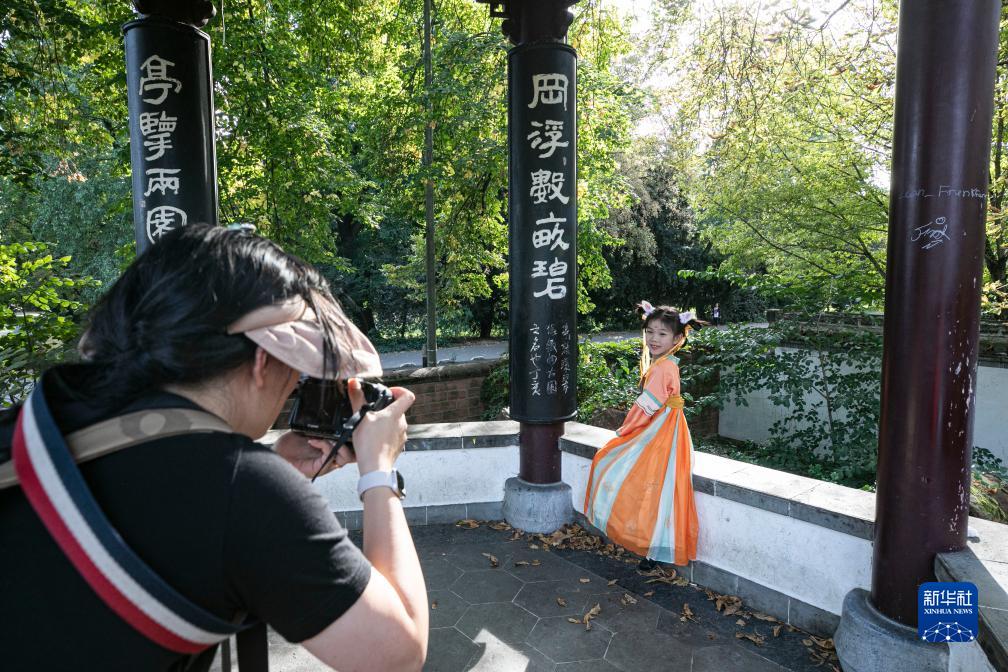 9月30日,一名身著(zhù)漢服的小朋友在德國法蘭克?!按喝A園”中拍照。