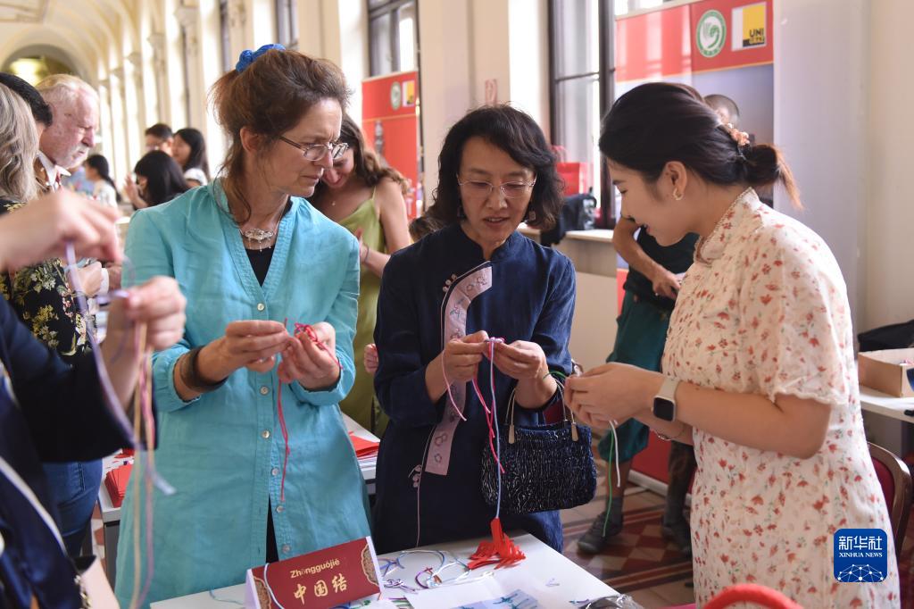 9月30日,在奧地利格拉茨大學(xué)活動(dòng)現場(chǎng),人們體驗編織中國結。