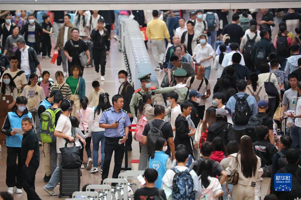 武警北京總隊執勤第六支隊官兵在北京西站候車(chē)廳為國慶假期出行的旅客指路(9月30日攝)。