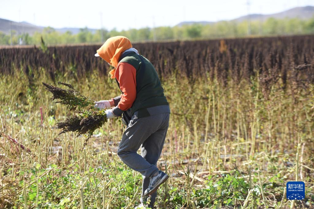 10月1日,在沽源縣白土窯鄉小西溝村,種植戶(hù)王秀梅在田間撿拾收割機收割后剩余的藜麥。