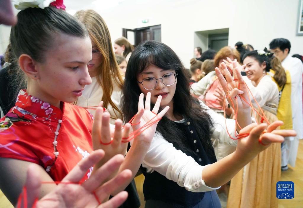 9月25日,在拉脫維亞大學(xué)孔子學(xué)院舉辦的中秋節慶?;顒?dòng)上,一名拉脫維亞女孩體驗中國傳統游戲翻繩。
