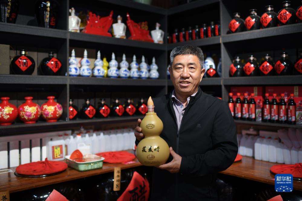 在山西磧口古鎮,張海龍在展示醋產(chǎn)品(9月26日攝)。張海龍之前是卡車(chē)司機,2018年,他在磧口古鎮開(kāi)了一家山西陳醋店,吸引不少游客光顧。