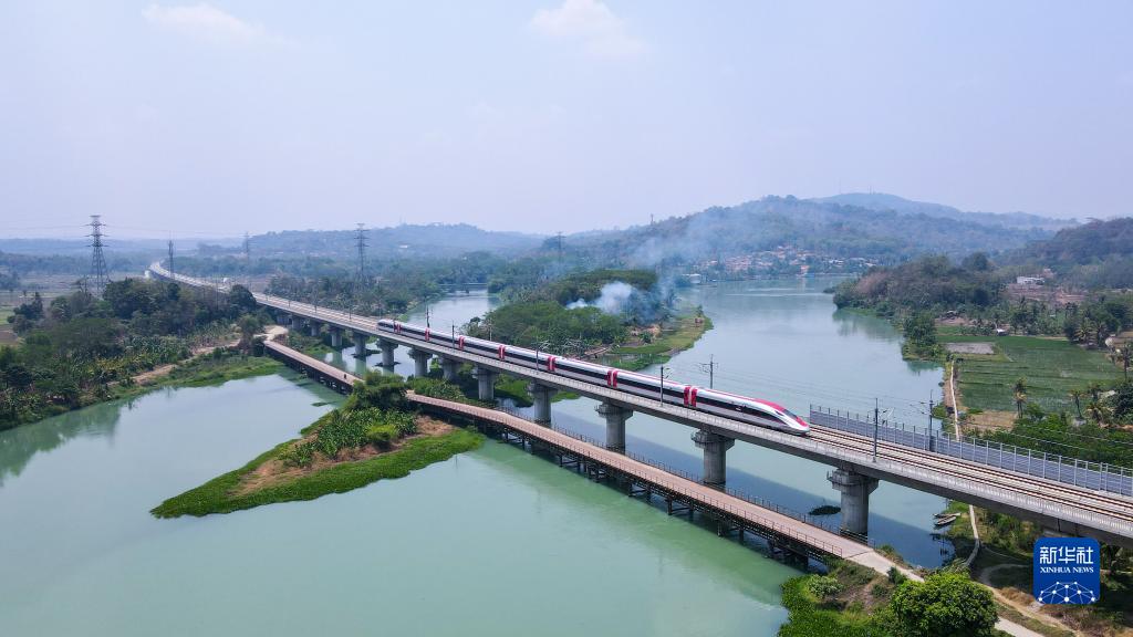 這是9月30日在印度尼西亞普哇加達拍攝的一列行駛中的雅萬(wàn)高鐵高速動(dòng)車(chē)組(無(wú)人機照片)。