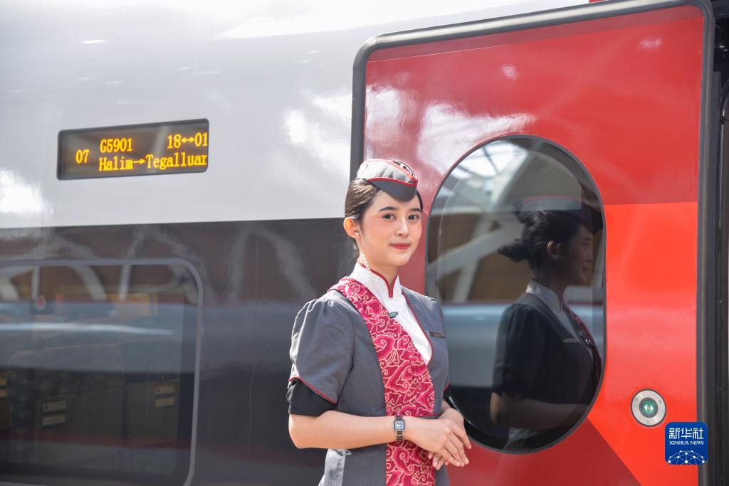10月2日,在印度尼西亞雅加達哈利姆高鐵站,乘務(wù)人員歡迎乘客和嘉賓。