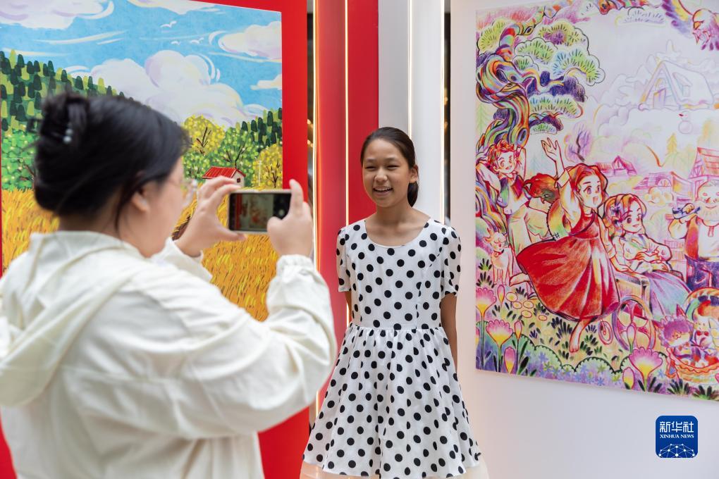 10月2日,人們在上海徐家匯書(shū)院廣場(chǎng)“一書(shū)一畫(huà)”藝術(shù)畫(huà)展上展出的繪畫(huà)作品前拍照。