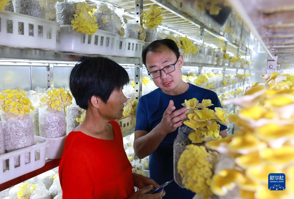 10月2日,河北省新河縣西流鄉南馬莊村一家榆黃蘑種植合作社的技術(shù)員(右)給社員講解榆黃蘑的管護知識。