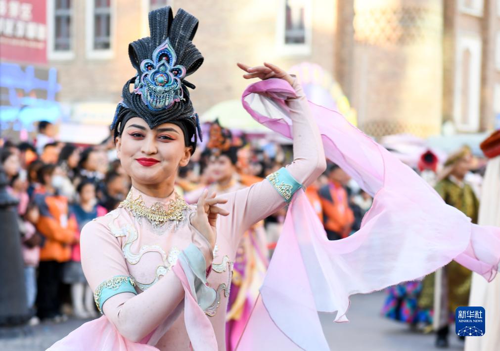 國慶假日期間,新疆烏魯木齊大巴扎步行街舉行的開(kāi)街儀式吸引了不少游客,別具一格的民族音樂(lè )、舞蹈、雜技等,讓游客近距離感受絲路文化。