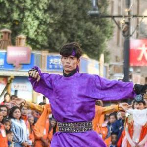 10月2日,在烏魯木齊大巴扎步行街,演員在表演節目。