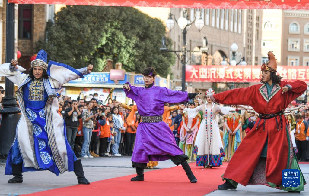 國慶假日期間,新疆烏魯木齊大巴扎步行街舉行的開(kāi)街儀式吸引了不少游客,別具一格的民族音樂(lè )、舞蹈、雜技等,讓游客近距離感受絲路文化。
