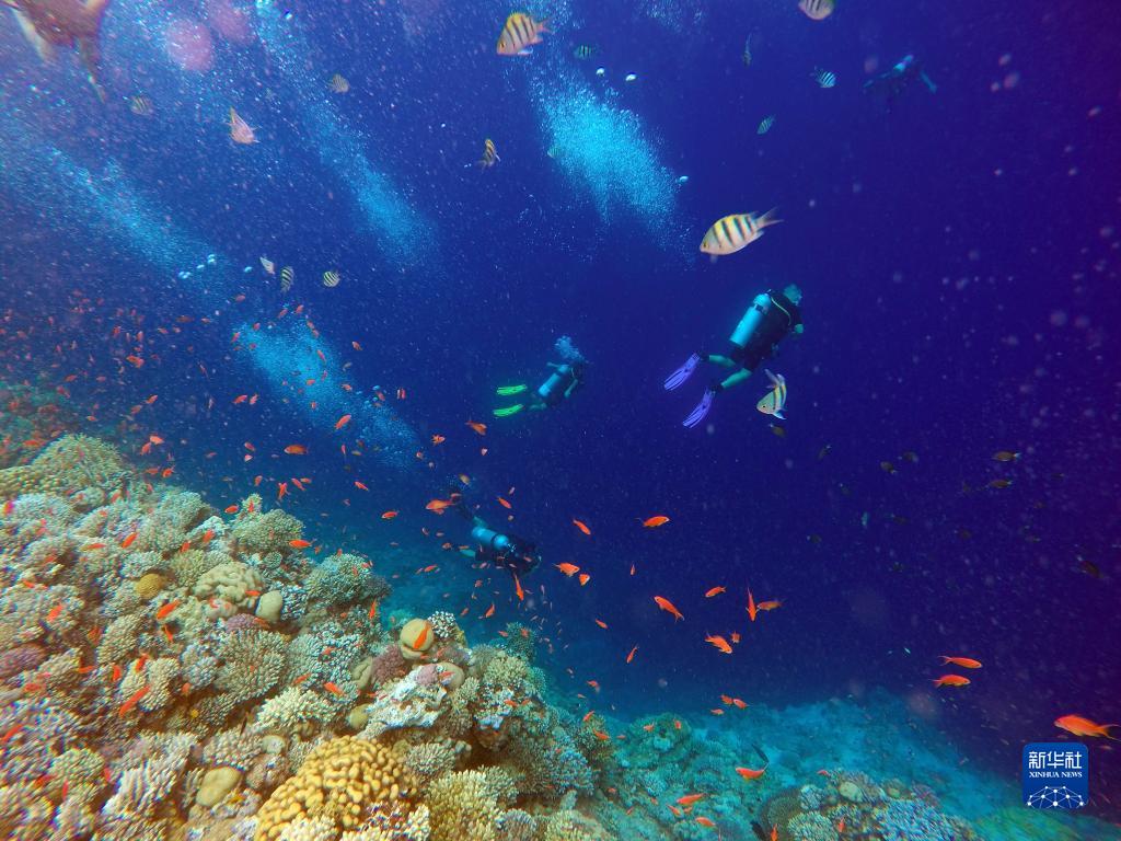 10月2日,人們在埃及西奈半島達哈布藍洞內的珊瑚旁深潛。