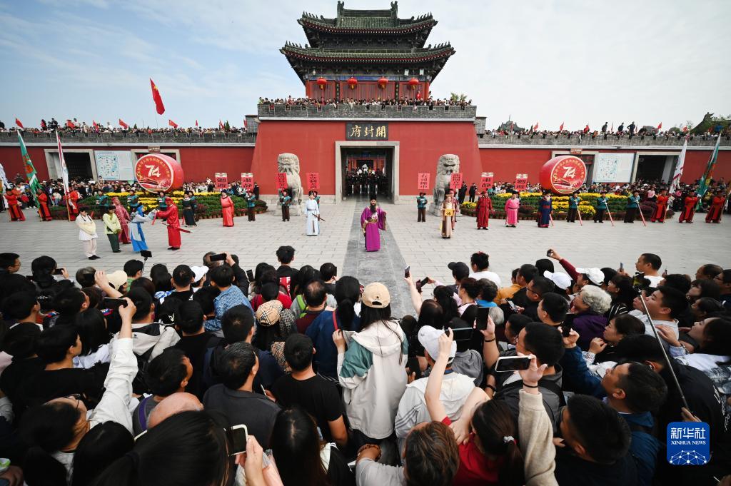 10月3日,游客在河南省開(kāi)封市開(kāi)封府門(mén)前觀(guān)看《開(kāi)衙迎賓》儀式。