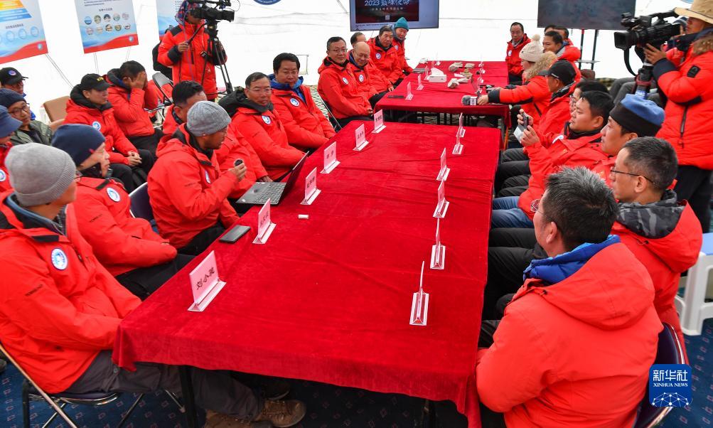 在海拔4950米的卓奧友峰科考大本營(yíng),科考隊員趙華標(手拿麥克風(fēng)者看電腦者)宣讀剛剛接收到的頂峰氣象觀(guān)測數據,標志著(zhù)峰頂自動(dòng)氣象站架設成功,成功傳回觀(guān)測數據(10月1日攝)。
