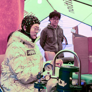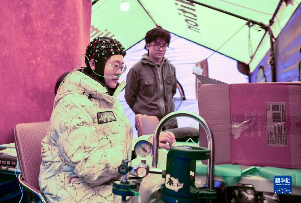 在卓奧友峰登山大本營(yíng),科考隊員(前)佩戴全腦彈性測試帽,測試有氧和無(wú)氧狀態(tài)下的人體認知能力(9月29日攝)。