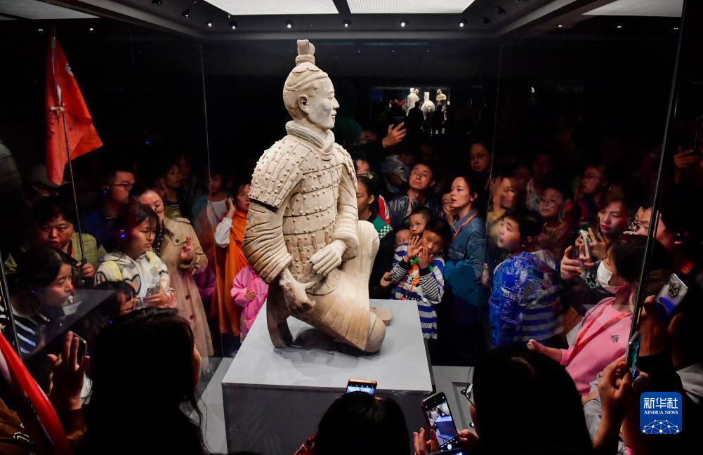 10月4日,游客在秦兵馬俑二號坑遺址內參觀(guān)跪射俑。