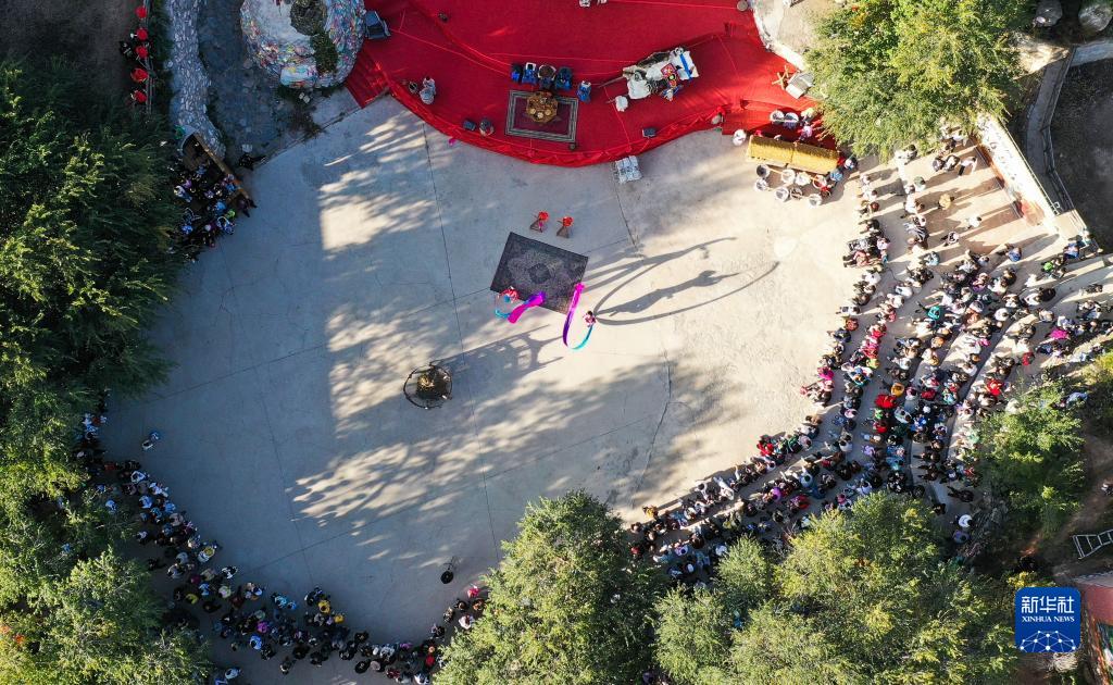 10月4日,游客在呼和浩特市莫尼山非遺小鎮觀(guān)看表演(無(wú)人機照片)。