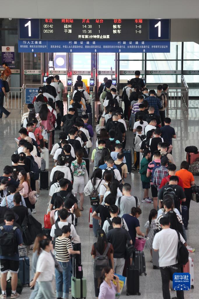 10月6日,旅客在福建廈門(mén)火車(chē)站候車(chē)大廳排隊等候驗票上車(chē)。