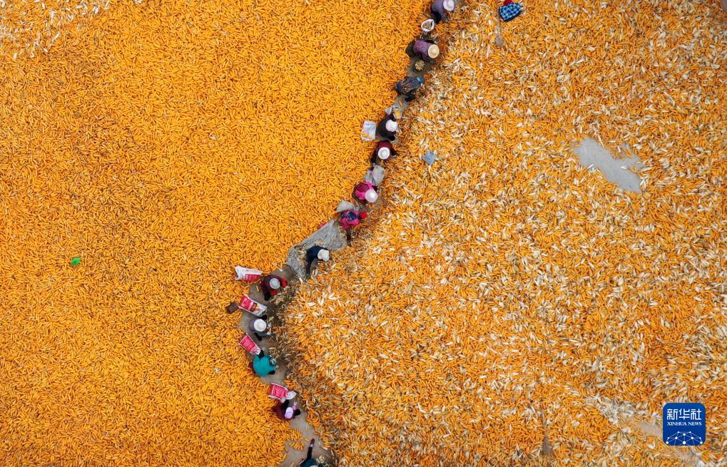 10月6日,在河北省石家莊市欒城區趙家莊村,農民將收獲的玉米剝皮(無(wú)人機照片)。