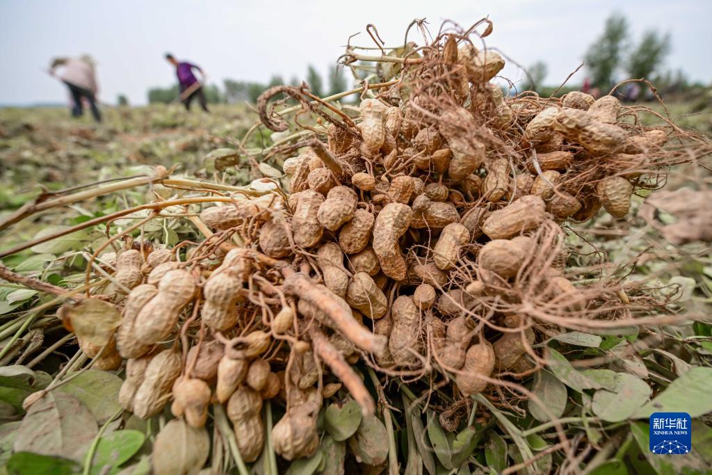 10月7日,農民在河南省洛陽(yáng)市孟津區會(huì )盟鎮黃河灘搶收花生。