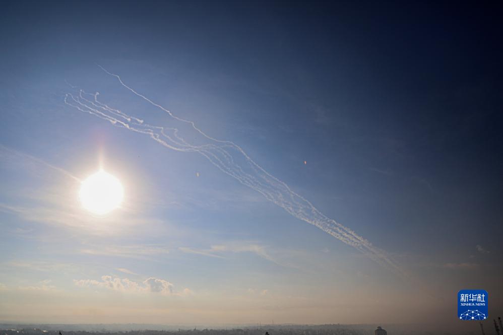 這是10月7日在加沙城上空拍攝的火箭彈飛過(guò)的痕跡。