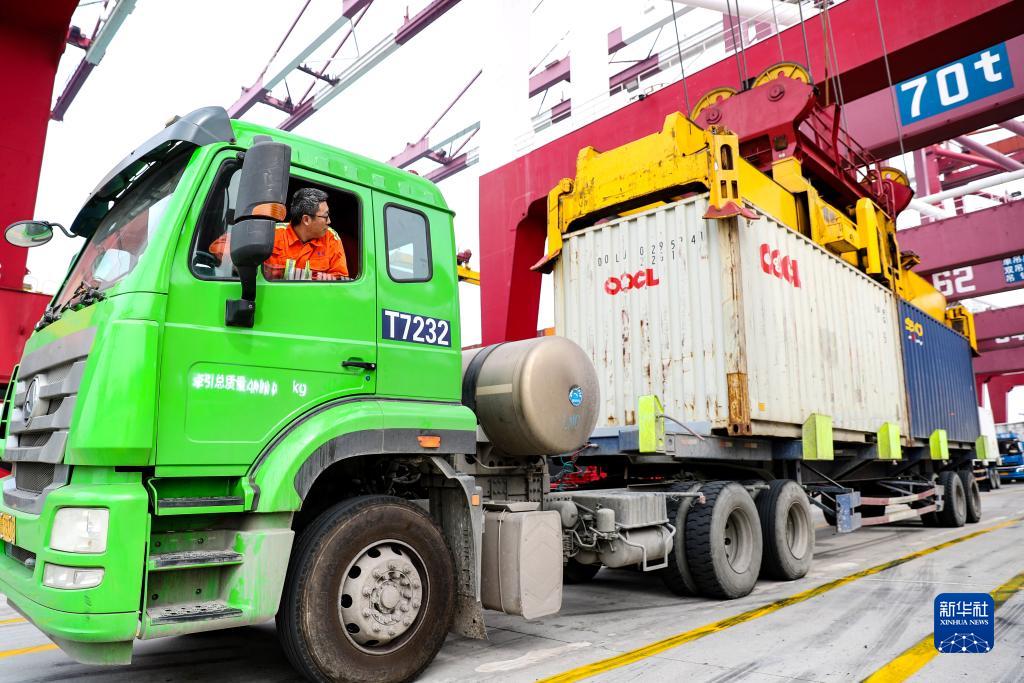 10月7日,集裝箱貨車(chē)在山東港口青島港運載貨物。