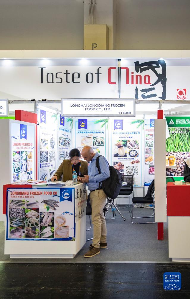 10月7日,參觀(guān)者在德國科隆國際食品博覽會(huì )的一個(gè)中國企業(yè)展臺參觀(guān)交談。新華社記者 張帆 攝