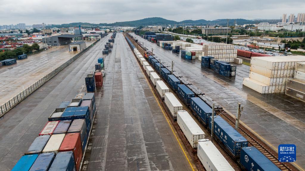 10月8日,“滬滇·瀾湄線(xiàn)”國際貨運班列駛出昆明市王家營(yíng)西站(無(wú)人機照片)。