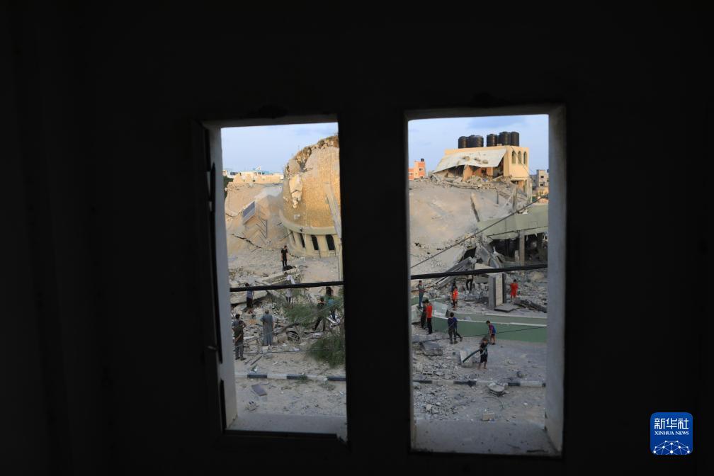 10月8日,在加沙地帶南部城市汗尤尼斯,人們站在一座被以色列空襲炸毀的清真寺旁。