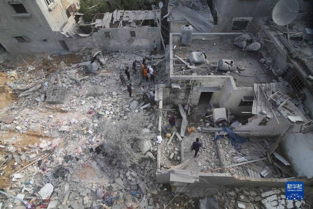 10月8日,在加沙地帶南部城市拉法,人們查看被以色列空襲炸毀的建筑。