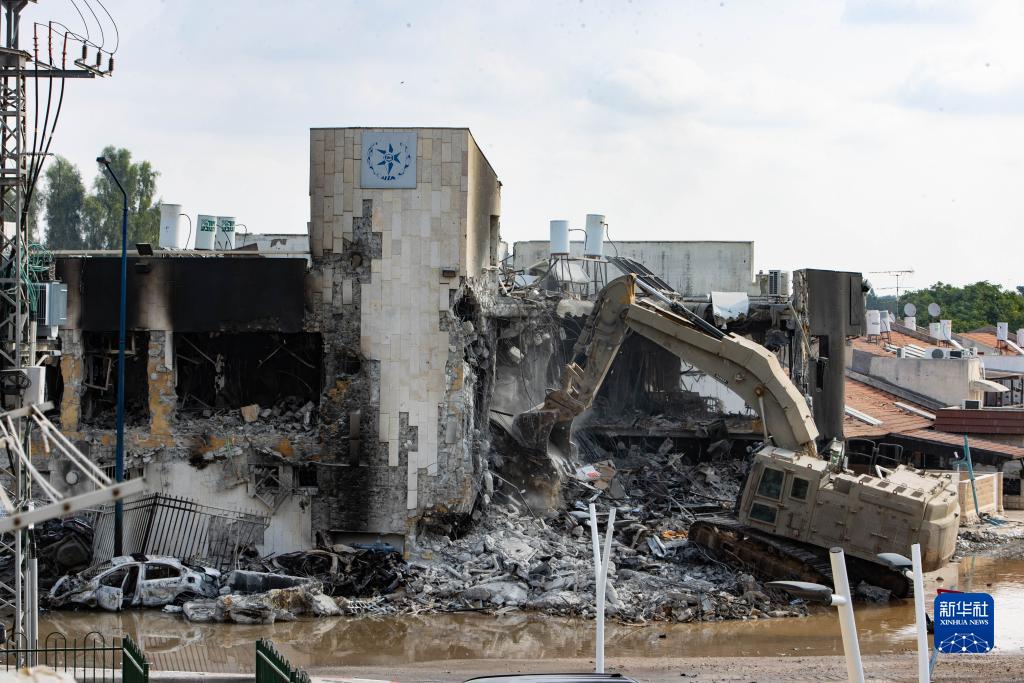 10月8日,在以色列南部城市斯代羅特,以軍將哈馬斯武裝人員曾躲藏的警察局辦公樓拆除。