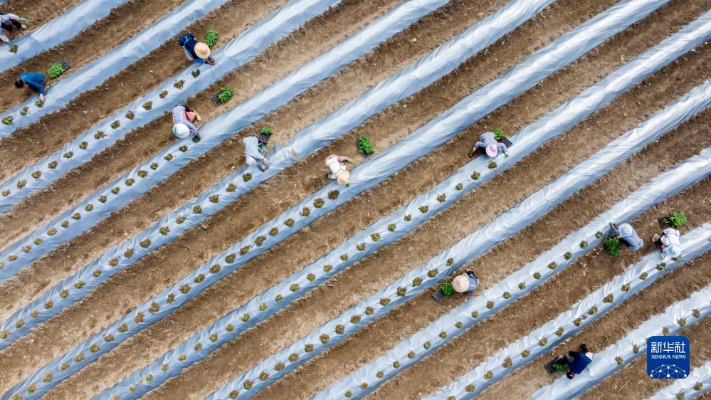 10月8日,村民在貴州省黔南布依族苗族自治州羅甸縣逢亭鎮腮里村的田間移栽蔬菜苗(無(wú)人機照片)。