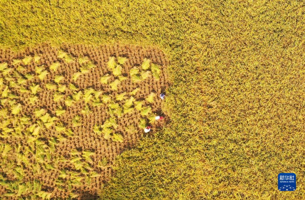10月8日,農民在貴州省銅仁市松桃苗族自治縣盤(pán)信鎮柳浦村收割晚稻(無(wú)人機照片)。