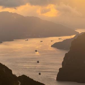 10月8日,船舶行駛在長(cháng)江三峽西陵峽湖北省宜昌市秭歸縣水域(無(wú)人機照片)。