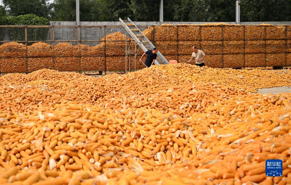 10月8日,農民在河北省隆堯縣雙碑鄉雙碑村一處玉米收儲點(diǎn)內將收獲的玉米封囤歸倉。