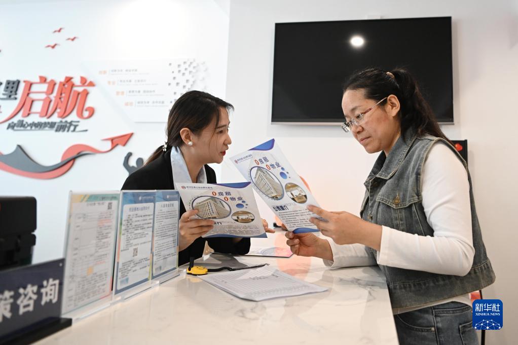 10月8日,一名創(chuàng )業(yè)者(右)在石家莊新華區奧火創(chuàng )業(yè)孵化基地前臺進(jìn)行創(chuàng )業(yè)咨詢(xún)。