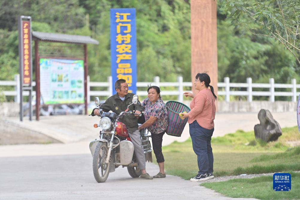 楊寧(右一)和送百香果到加工廠(chǎng)的村民交流(10月8日攝)。新華社記者 黃孝邦 攝