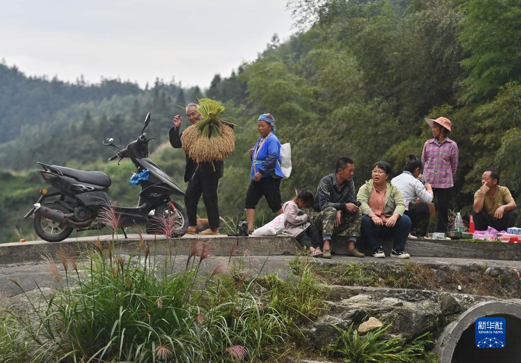 楊寧和鄰村(吉曼村)村民們在田邊協(xié)商山泉水引水工程相關(guān)事宜(10月8日攝)。新華社記者 黃孝邦 攝