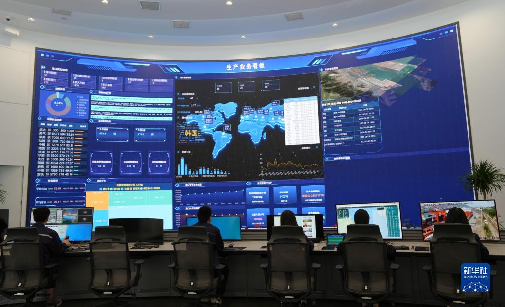 5月9日,工作人員在江蘇連云港的中哈連云港物流合作基地數字化調度中心查看港口作業(yè)情況。