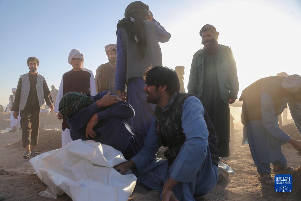 10月9日,在阿富汗西部赫拉特省津達詹區,地震遇難者的親友在葬禮上慟哭。