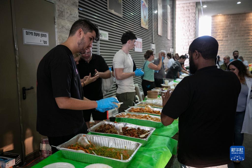 10月9日,在以色列南部城市阿什凱隆一家大型醫院,志愿者向民眾分發(fā)食物。