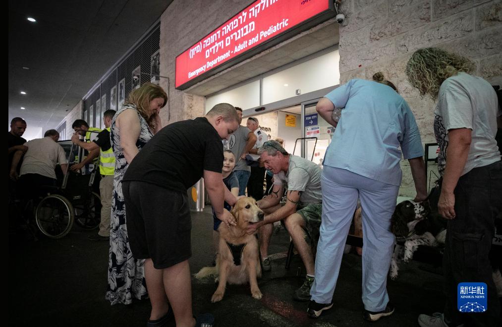 10月9日,在以色列南部城市阿什凱隆一家大型醫院,經(jīng)過(guò)訓練的心理治療犬正在給民眾提供服務(wù)。