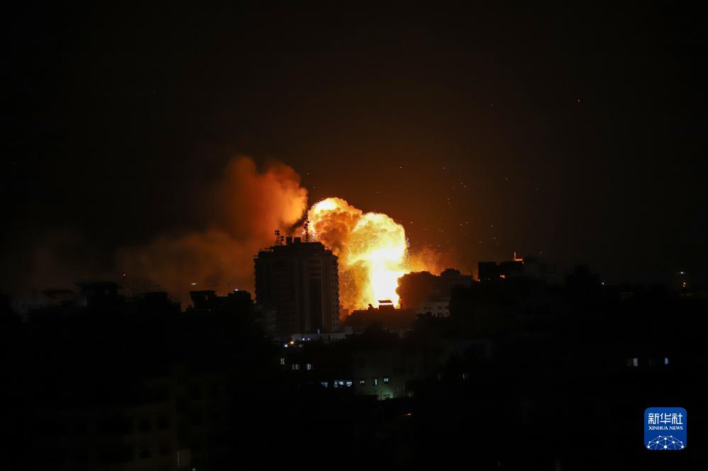 這是10月9日晚在加沙城拍攝的以色列軍隊空襲產(chǎn)生的火光。